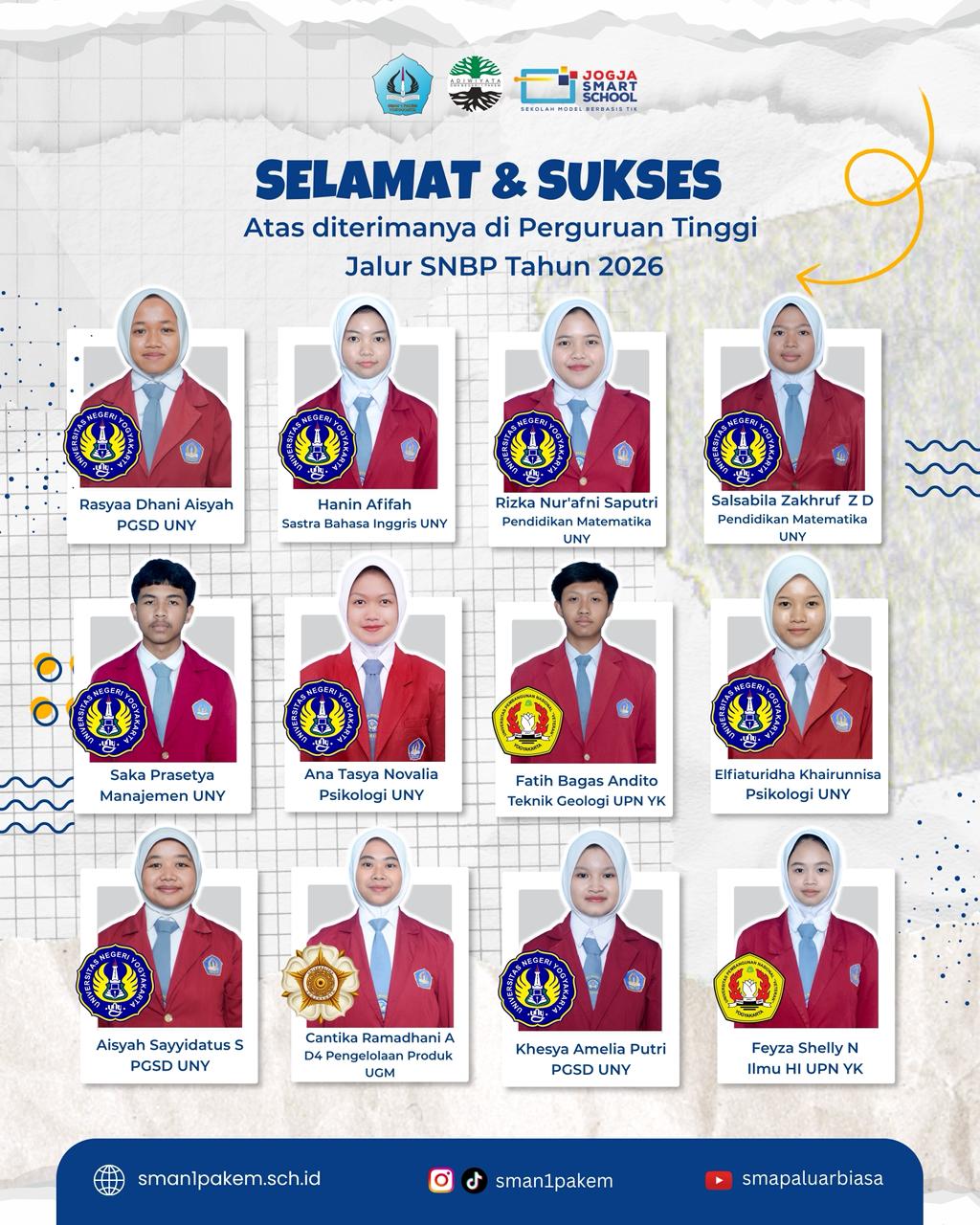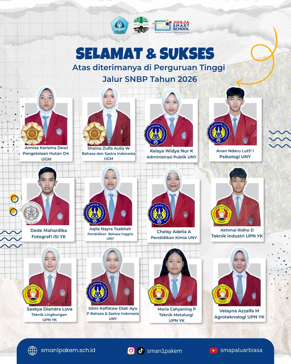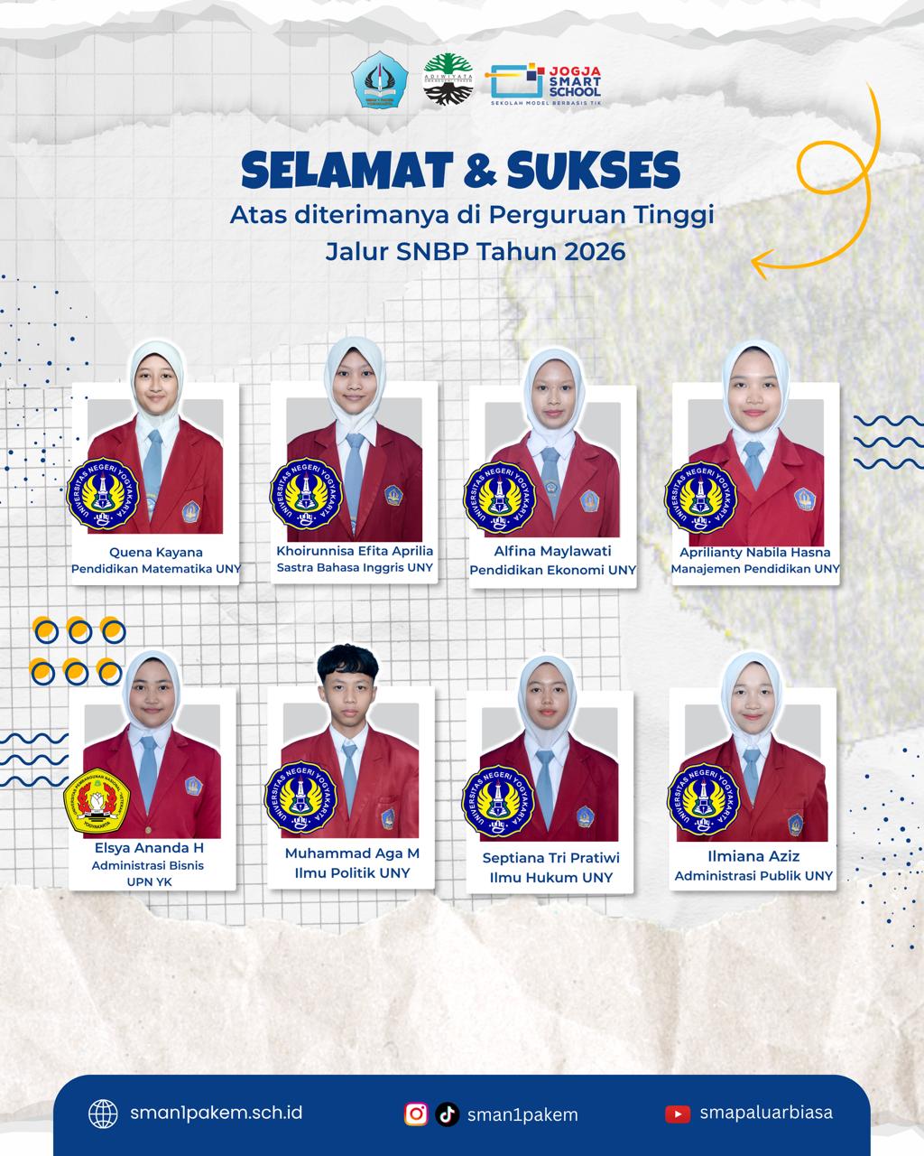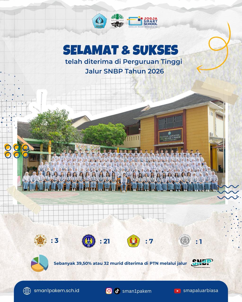 Sleman, 1 April 2026 โ Sebanyak 32 siswa SMA Negeri 1 Pakem berhasil mengukir prestasi gemilang dengan dinyatakan lolos seleksi jalur Seleksi Nasional Berdasarkan Prestasi (SNBP) tahun 2026 yang diumumkan secara resmi pada Selasa, 31 Maret 2026 pukul 15.00 WIB. Pencapaian ini mencatatkan persentase kelulusan sebesar 39,5% dari total 81 siswa yang masuk kuota eligibel, dengan sebaran penerimaan di berbagai Perguruan Tinggi Negeri (PTN) bergengsi di Yogyakarta yang meliputi 3 siswa di Universitas Gadjah Mada (UGM), 21 siswa di Universitas Negeri Yogyakarta (UNY), 7 siswa di UPN “Veteran” Yogyakarta, dan 1 siswa di Institut Seni Indonesia (ISI) Yogyakarta. Keberhasilan ini tidak hanya membuktikan kualitas akademik siswa SMAN 1 Pakem, tetapi juga menjadi motivasi besar bagi seluruh warga sekolah untuk terus mempertahankan tradisi prestasi di masa yang akan datang.
